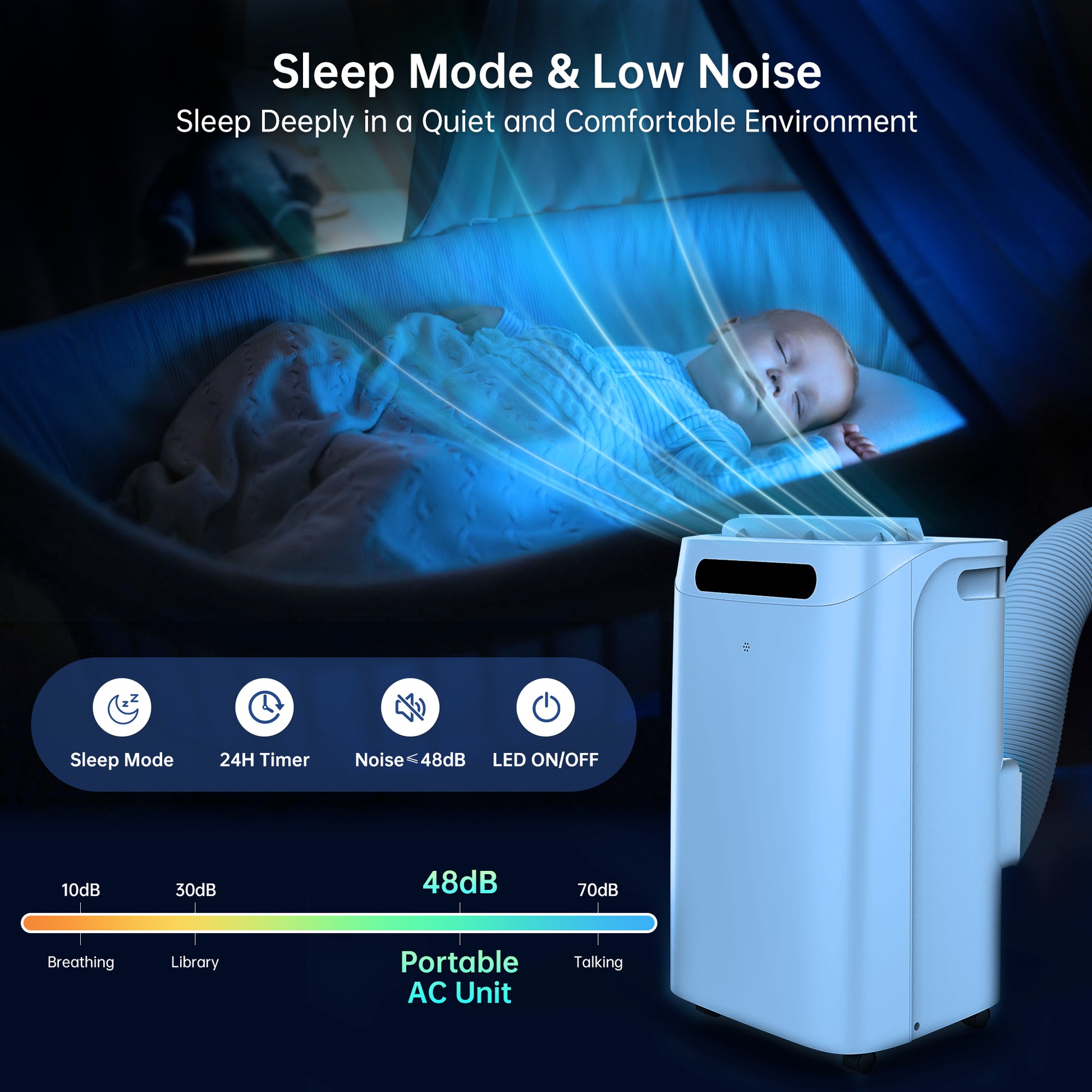 - ❄️【TEMPORIZADOR DE 24 HORAS Y MODO DE SUSPENSIÓN】Diseñado con temporizador programable de 24 horas, no tendrá que levantarse en mitad de la noche para apagar el aire acondicionado. El modo de suspensión garantiza un funcionamiento silencioso con bajo nivel de ruido (52 dB), ofreciéndole un sueño tranquilo y confortable toda la noche con la temperatura ideal.