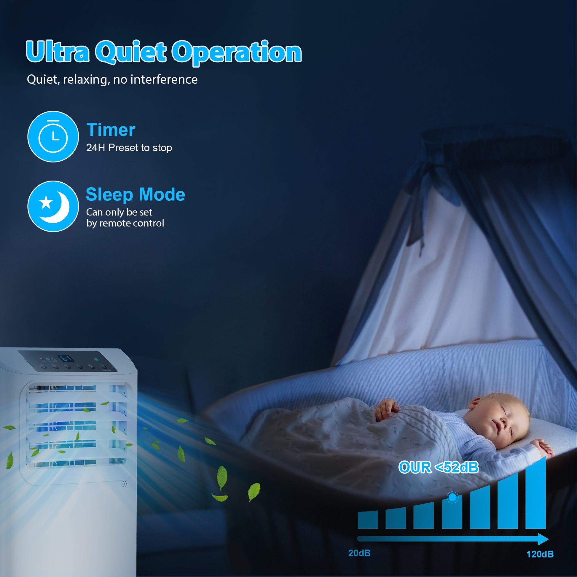 - ❄️【TEMPORIZADOR DE 24 HORAS Y MODO DE SUSPENSIÓN】Diseñado con temporizador programable de 24 horas, no tendrá que levantarse en mitad de la noche para apagar el aire acondicionado. El modo de suspensión garantiza un funcionamiento silencioso con bajo nivel de ruido (52 dB), ofreciéndole un sueño tranquilo y confortable toda la noche con la temperatura ideal.