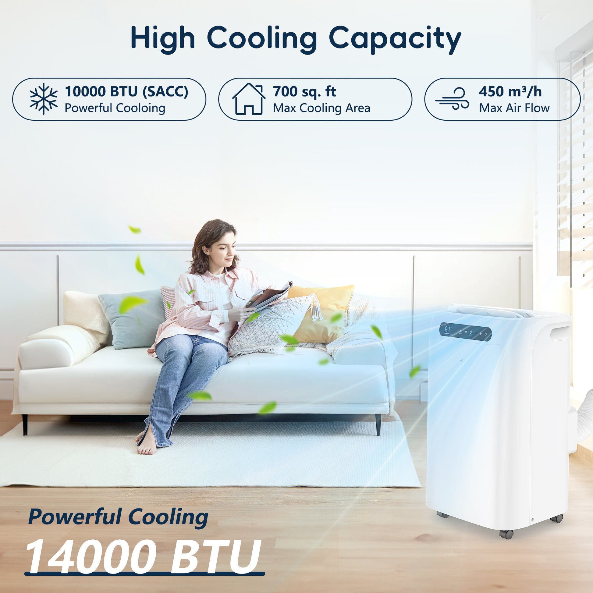 【 14000 BTU de Refrigeración Potente 】 Este aire acondicionado portátil cuenta con una potente capacidad de refrigeración de 14000 BTU, lo que lo hace ideal para habitaciones grandes de hasta 700 pies cuadrados. Su función de oscilación automática de 0 a 80 ° permite una circulación eficaz del aire por toda la habitación, garantizando un enfriamiento constante y rápido.