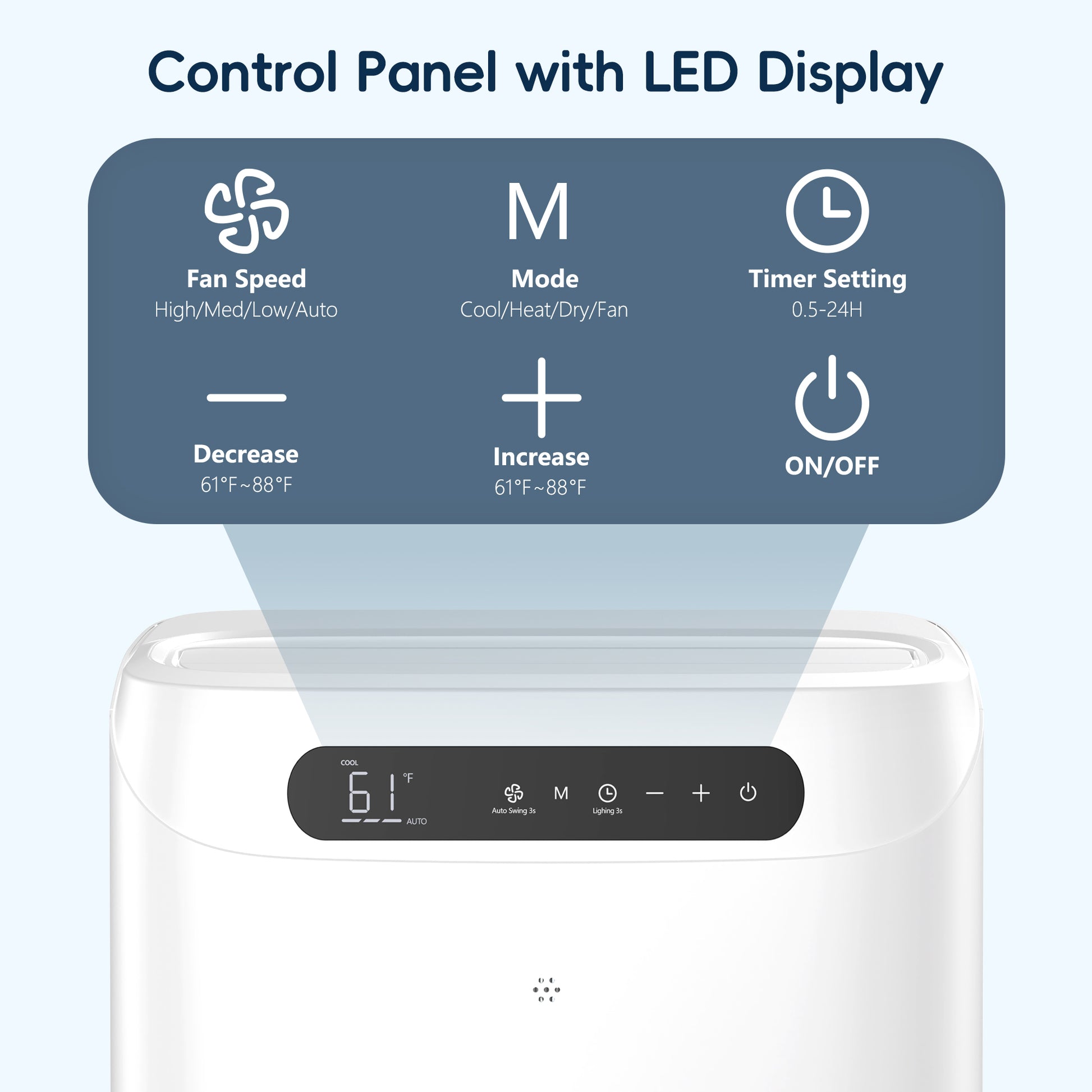 【 Panel de control táctil frontal y control remoto 】 Cuenta con un panel de control táctil digital que incluye ajustes de potencia, modo, temporizador, temperatura y velocidad del ventilador. Otras funciones, como el selector de unidades ( ° C/ ° F), el encendido/apagado de la luz LED, la oscilación automática y el modo de suspensión, se pueden ajustar con el control remoto incluido, con un alcance de hasta 7 metros.