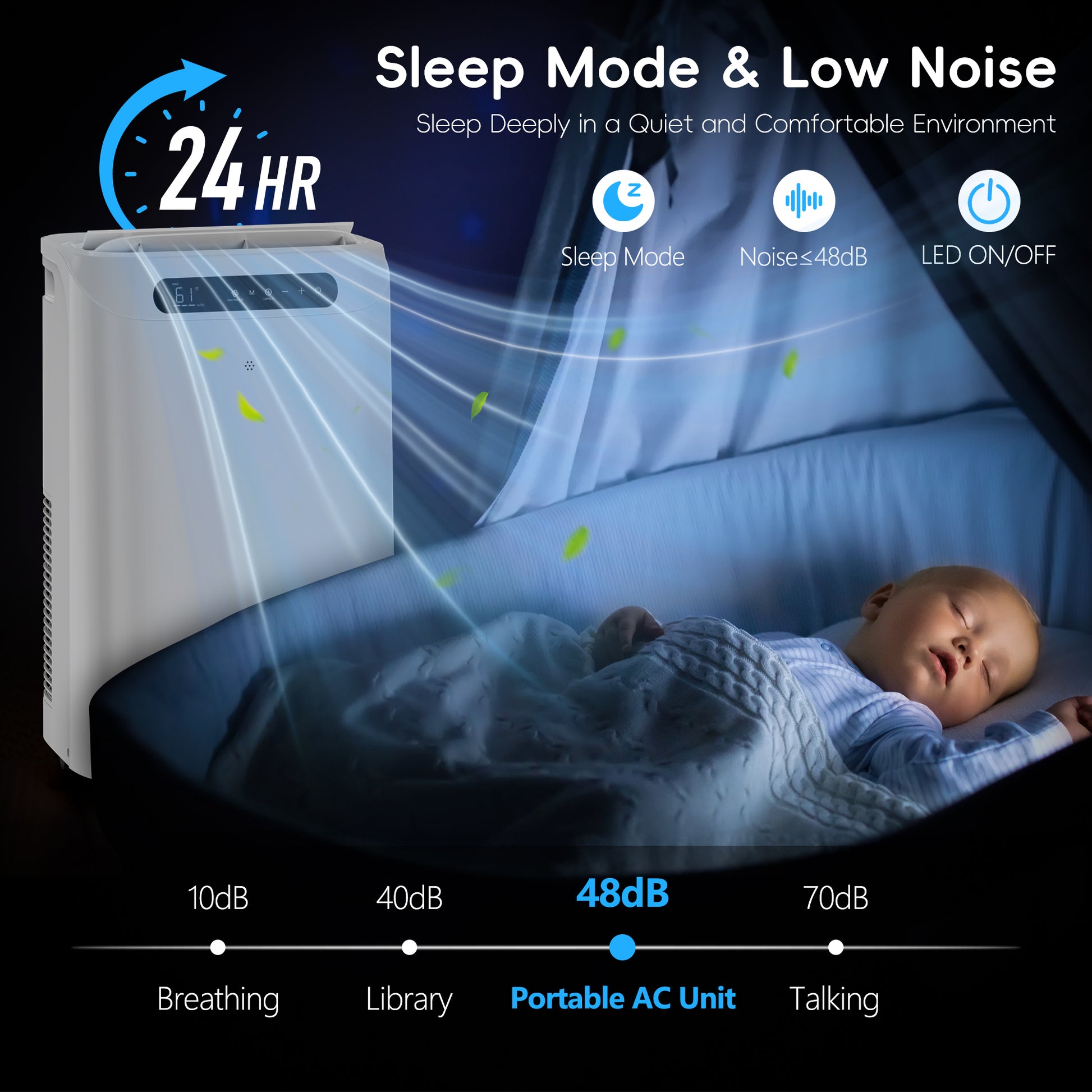 【 Diseño silencioso y seguro 】 Para su comodidad y seguridad, este aire acondicionado cuenta con un modo de suspensión con baja velocidad del ventilador y bajo nivel de ruido ( ≦ 48 dB), y un temporizador de 1 a 24 horas que se puede configurar para encender y apagar automáticamente. Dispone de dos opciones de drenaje (manual o continuo), y la protección contra desbordamiento apaga automáticamente la unidad cuando el tanque de agua está lleno.